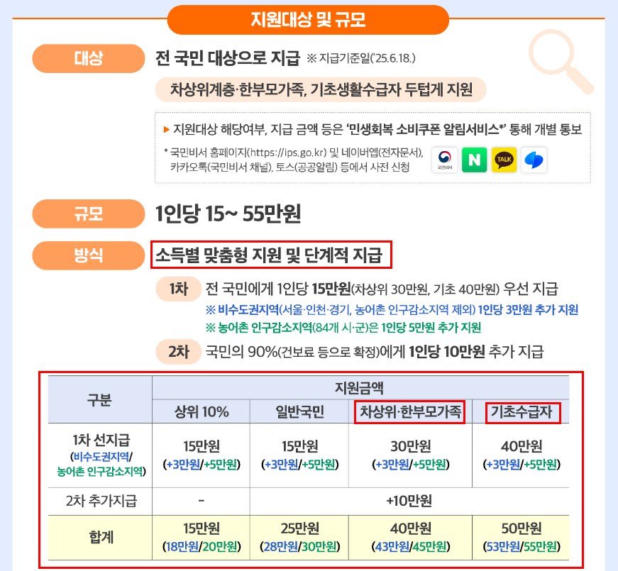 - 일반 국민 : 총 25만 원 (1차 15만 원 + 2차 10만 원)