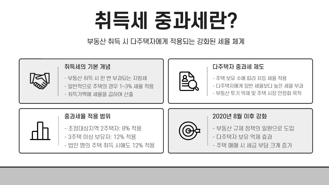 취득세는 부동산을 취득할 때 한 번 부과되는 지방세로, 일반적으로 주택의 경우 1~3%의 세율이 적용됩니다. 그러나 2020년 8월 이후 정부의 부동산 규제 강화 정책에 따라 다주택자에게는 최대 12%까지 취득세 중과세율이 적용됩니다.
