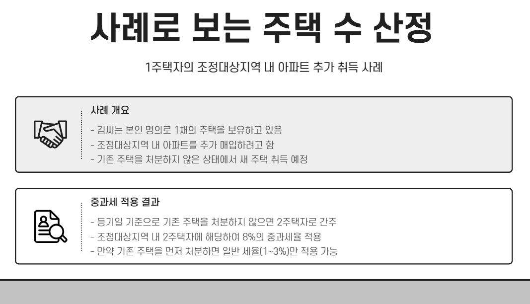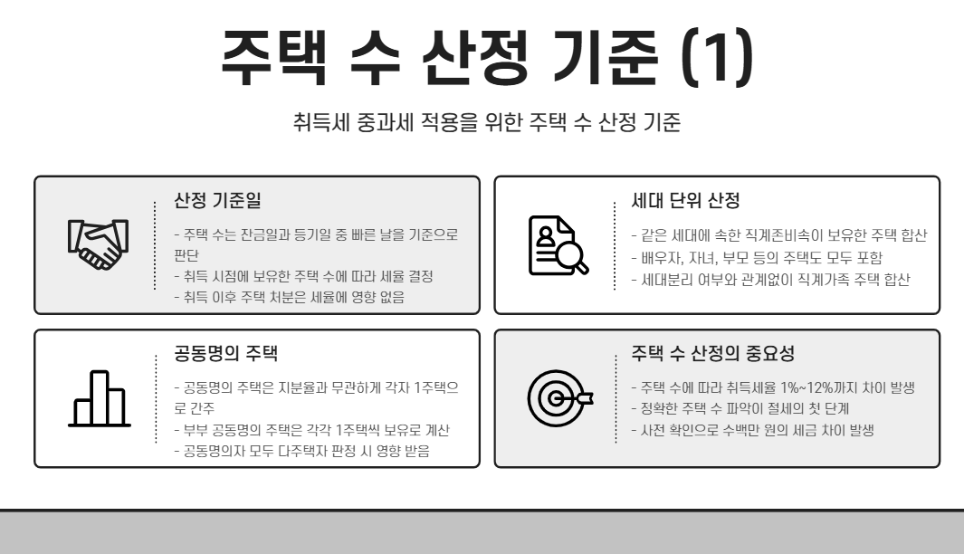 - 산정 기준일: 주택 수는 잔금일과 등기일 중 빠른 날을 기준으로 판단합니다.