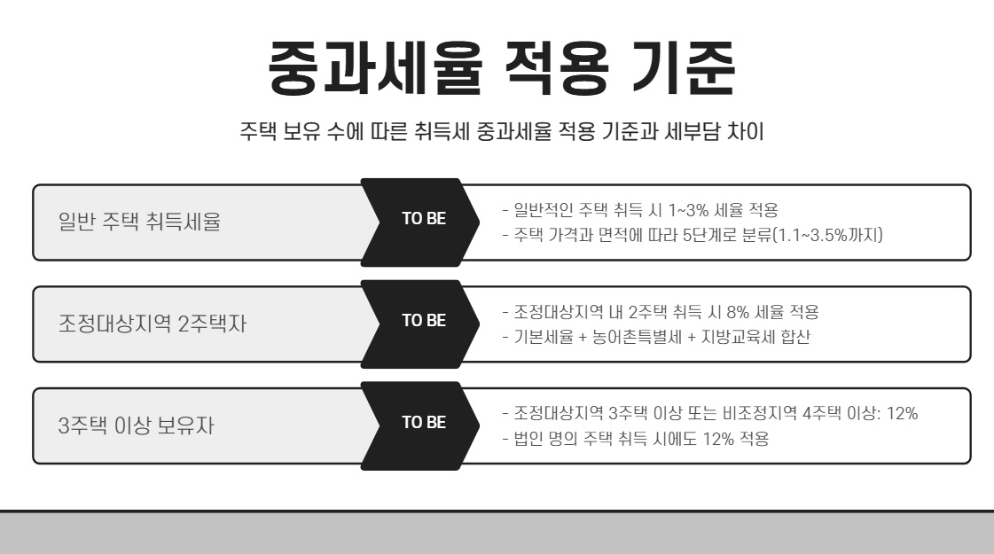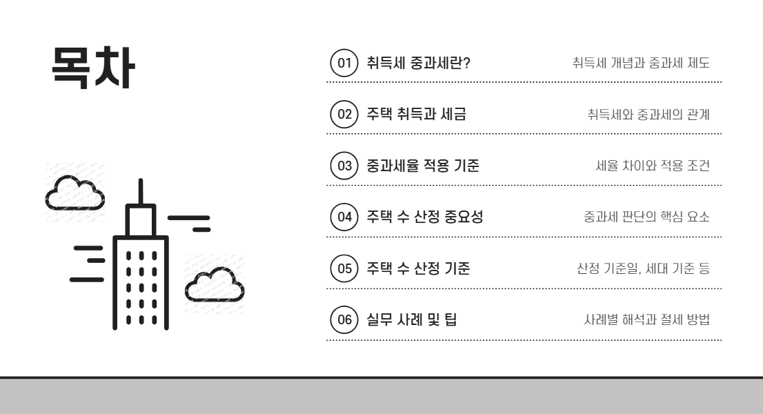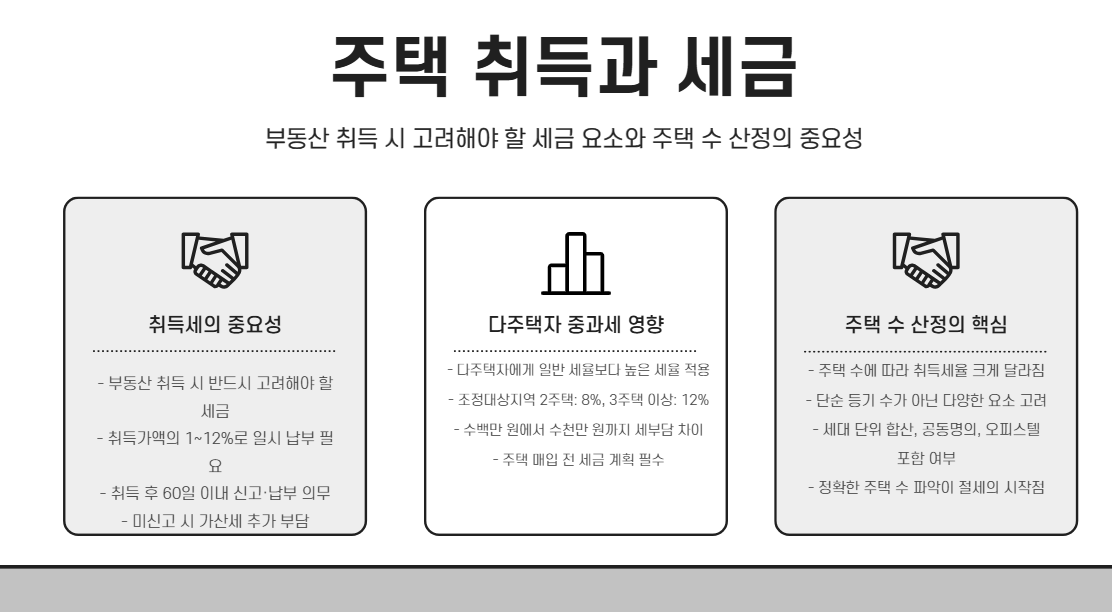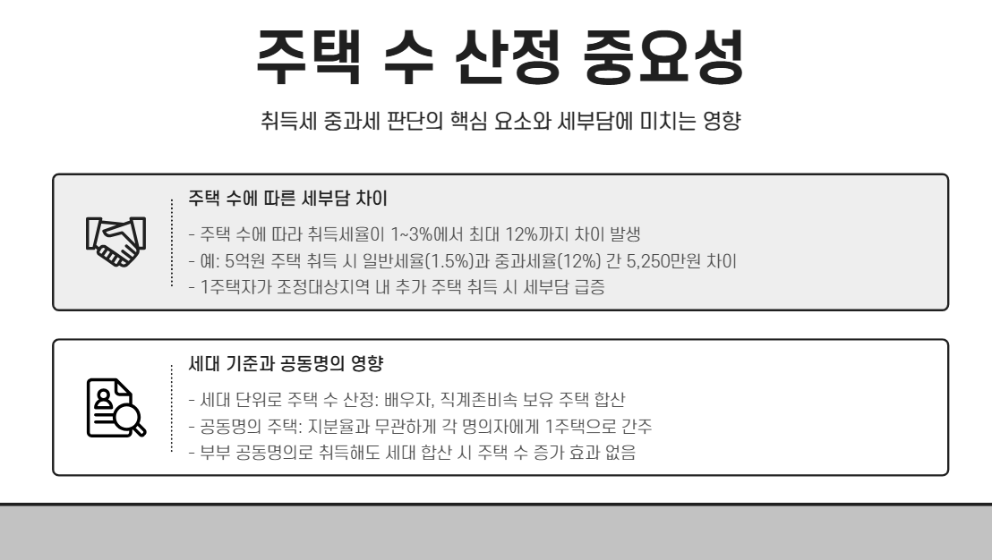 부동산을 취득할 때 반드시 고려해야 할 요소 중 하나가 바로 ‘취득세’입니다. 특히 다주택자에게는 일반 세율보다 높은 ‘중과세’가 적용될 수 있어 세금 부담이 상당히 커질 수 있습니다. 이때 핵심적으로 작용하는 것이 바로 “주택 수 산정 기준”입니다. 어떤 주택이 몇 채로 간주되는지를 이해하는 것이 정확한 세금 계산의 출발점이 됩니다.