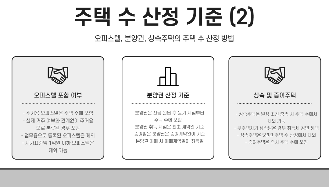 - 오피스텔과 분양권: 실거주하는 오피스텔은 주택 수에 포함되며, 분양권은 입주 후 등기 시 포함됩니다.