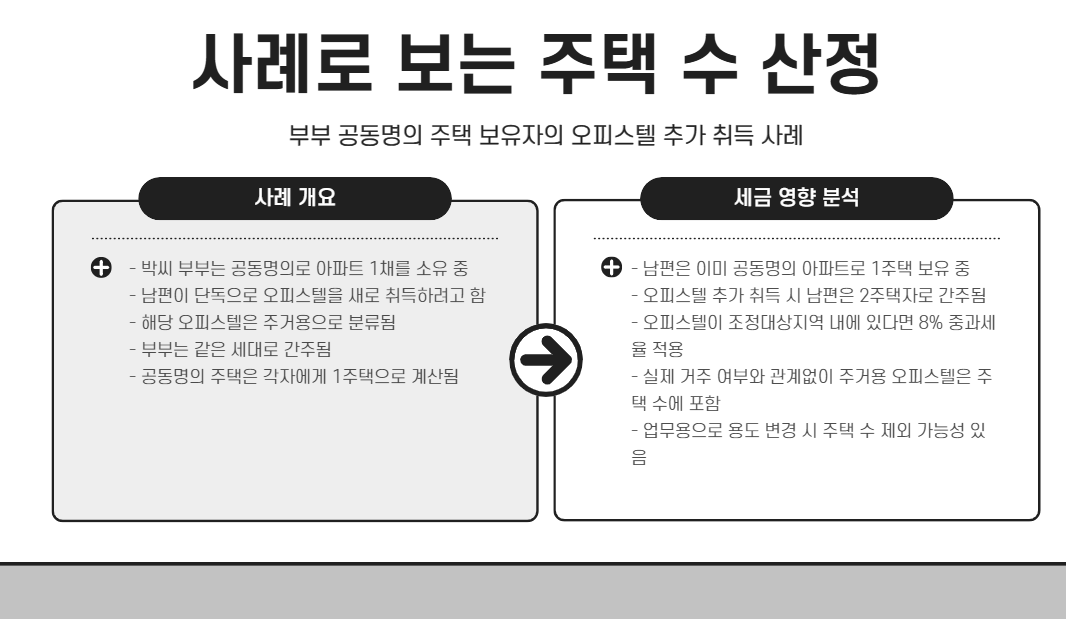 박씨 부부는 공동명의로 아파트 1채를 소유 중입니다. 남편이 단독으로 오피스텔(실제 거주 중)을 새로 취득하면, 남편은 2 주택자로 간주되어 중과세 대상입니다.